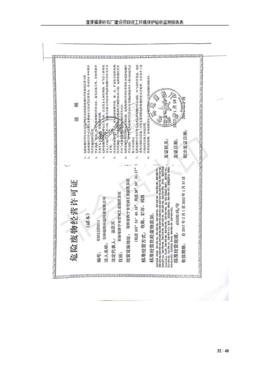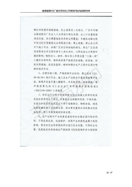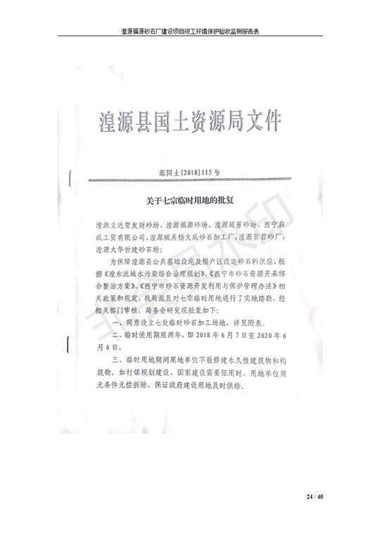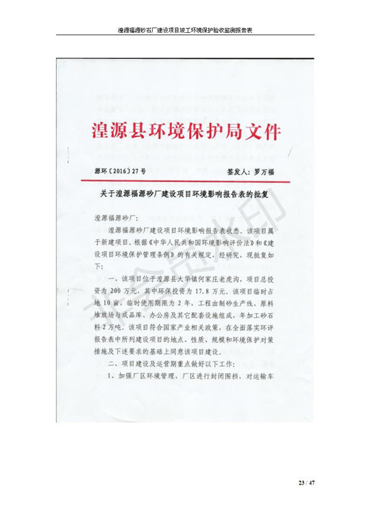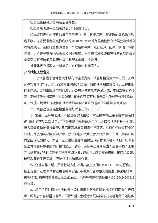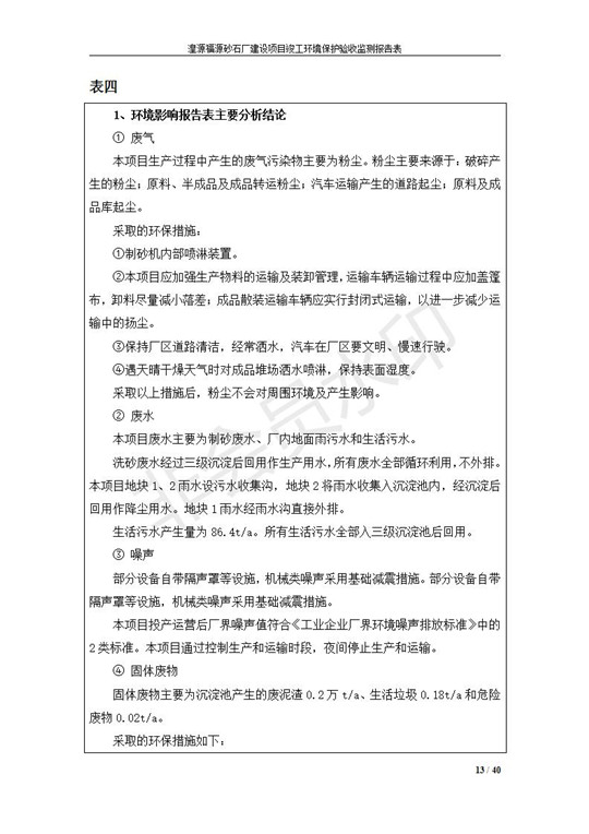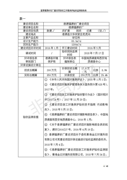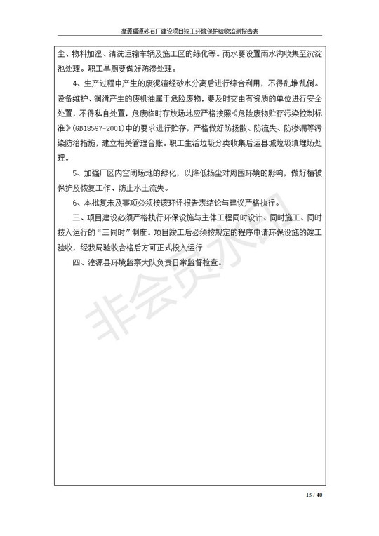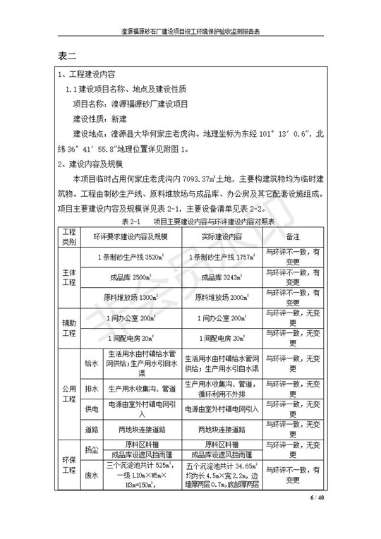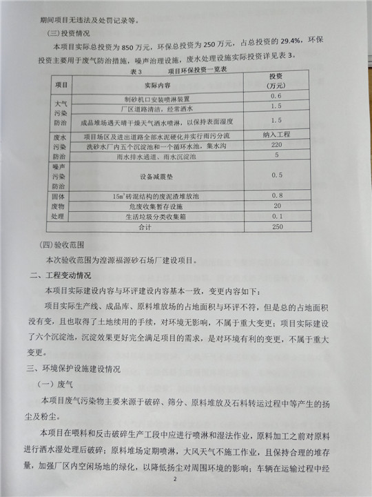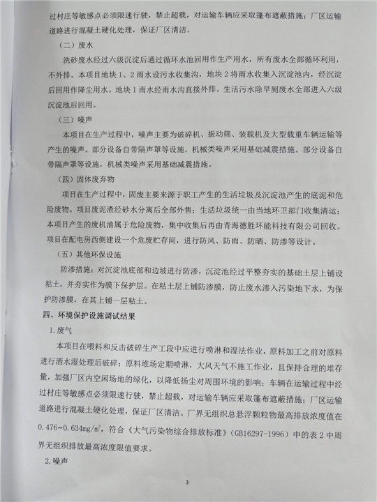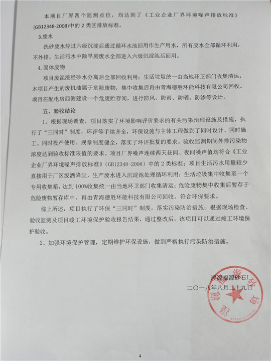 根據(jù)中華人民共和國國務(wù)院令第253號(hào)《建設(shè)項(xiàng)目環(huán)境保護(hù)管理?xiàng)l例》(中華人民共和國國務(wù)院令第682號(hào)《國務(wù)院關(guān)于修改〈建設(shè)項(xiàng)目環(huán)境保護(hù)管理?xiàng)l例〉的決定》和《建設(shè)項(xiàng)目竣工環(huán)境保護(hù)驗(yàn)收暫行辦法》,嚴(yán)格依照有關(guān)法律法規(guī),建設(shè)項(xiàng)目環(huán)境保護(hù)設(shè)施驗(yàn)收技術(shù)規(guī)范,本項(xiàng)目環(huán)評(píng)報(bào)告表和環(huán)保審批部門審批意見以及企業(yè)自行驗(yàn)收相關(guān)要求等對(duì)本項(xiàng)目進(jìn)行驗(yàn)收,本項(xiàng)目符合環(huán)保驗(yàn)收條件,可以通過環(huán)保驗(yàn)收。 湟源福砂廠建設(shè)項(xiàng)目竣工環(huán)境保護(hù)驗(yàn)收意見