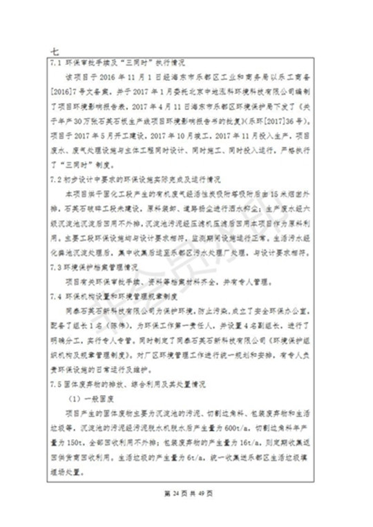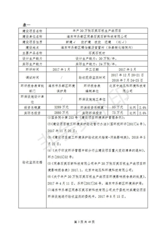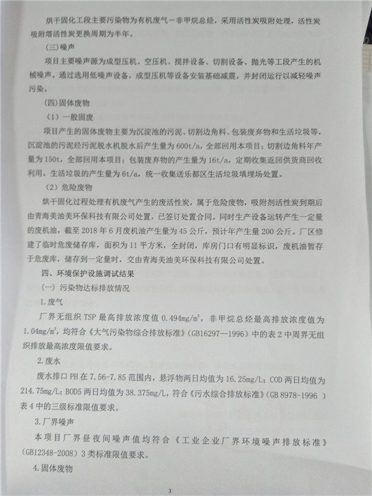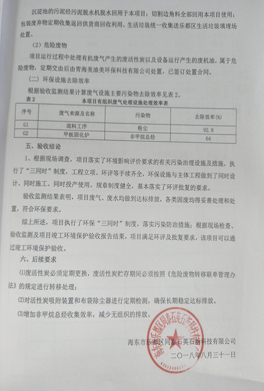根據(jù)中華人民共和國國務(wù)院令第253號(hào)《建設(shè)項(xiàng)目環(huán)境保護(hù)管理?xiàng)l例》(中華人民共和國國務(wù)院令第682號(hào)《國務(wù)院關(guān)于修改〈建設(shè)項(xiàng)目環(huán)境保護(hù)管理?xiàng)l例〉的決定》和《建設(shè)項(xiàng)目竣工環(huán)境保護(hù)驗(yàn)收暫行辦法》,嚴(yán)格依照有關(guān)法律法規(guī),建設(shè)項(xiàng)目環(huán)境保護(hù)設(shè)施驗(yàn)收技術(shù)規(guī)范,本項(xiàng)目環(huán)評(píng)報(bào)告表和環(huán)保審批部門審批意見以及企業(yè)自行驗(yàn)收相關(guān)要求等對(duì)本項(xiàng)目進(jìn)行驗(yàn)收,本項(xiàng)目符合環(huán)保驗(yàn)收條件,可以通過環(huán)保驗(yàn)收。 海東市樂都區(qū)同泰科技有限公司竣工環(huán)境保護(hù)驗(yàn)收監(jiān)測報(bào)告公示