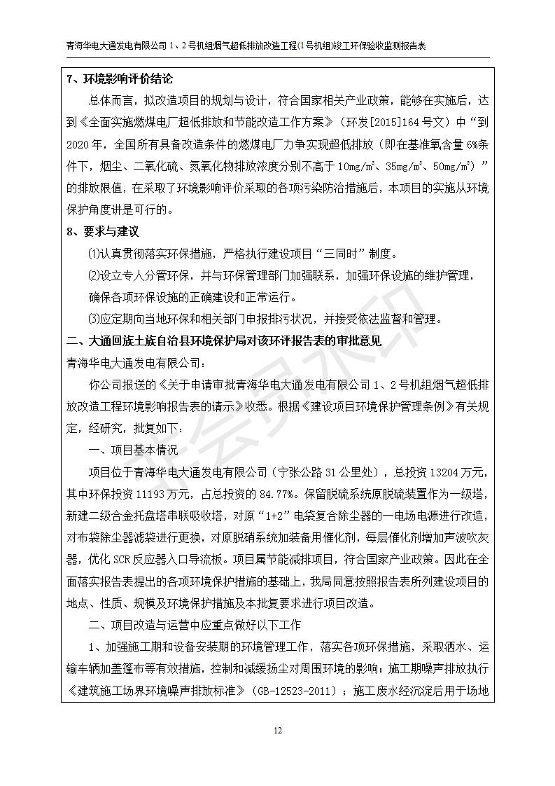 根據(jù)中華人民共和國國務(wù)院令第682號《國務(wù)院關(guān)于修改〈建設(shè)項目環(huán)境保護管理條例〉的決定》和《建設(shè)項目竣工環(huán)境保護驗收暫行辦法》(國務(wù)院令682號),青海華電大通發(fā)電有限公司1、2號機組煙氣超低排放改造工程(1號機組) (包括竣工環(huán)境保護驗收監(jiān)測報告表和驗收意見)公示如下。 一、項目名稱:青海華電大通發(fā)電有限公司1、2號機組煙氣超低排放改造工程(1號機組) 竣工環(huán)境保護驗收監(jiān)測報告表 二、地點:青海省西寧市大通縣寧張公路31公里處 三、建設(shè)單位:青海華電大通發(fā)電有限公司 四、建設(shè)內(nèi)容:1號機組煙氣超低排放改造,1號機組改造內(nèi)容為脫硫系統(tǒng)保留原脫硫裝置作為一級塔,新建二級合金托盤塔串聯(lián)吸收塔;對原“1+2”電袋復(fù)合除塵器的一電場電源進行改造,對布袋除塵器濾袋進行更換;對原脫硝系統(tǒng)選擇性催化還原法(SCR)脫硝工藝加裝備用催化劑,每層催化劑增加聲波吹灰器,優(yōu)化SCR反應(yīng)器入口導(dǎo)流板。 五、聯(lián)系人:張工 六、聯(lián)系電 話:0971-6515411 七、公示時間:二〇一九年二月十三日至二〇一九年三月十二日 公示期間,對上述公示內(nèi)容如有異議,請以書面形式反饋,個人須署真實姓名,單位須加蓋公章。