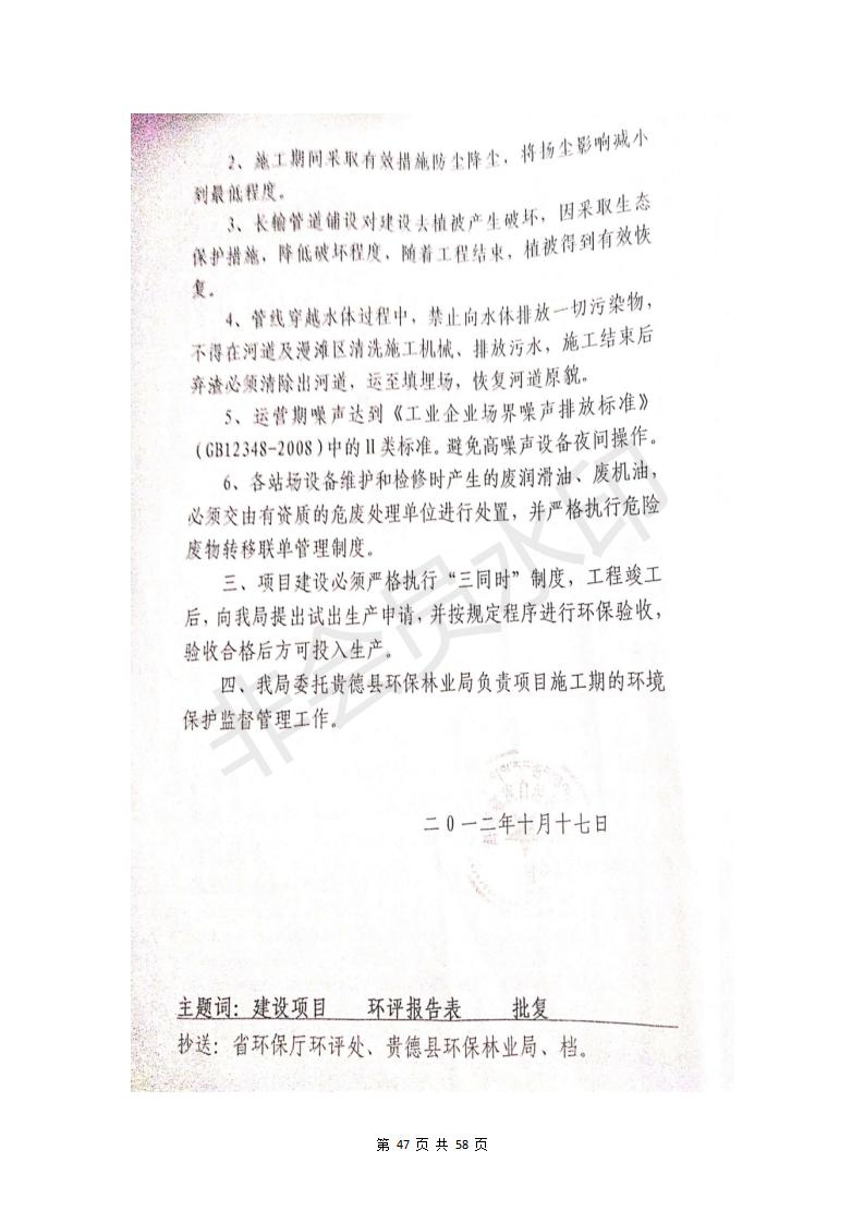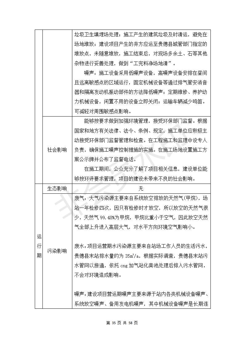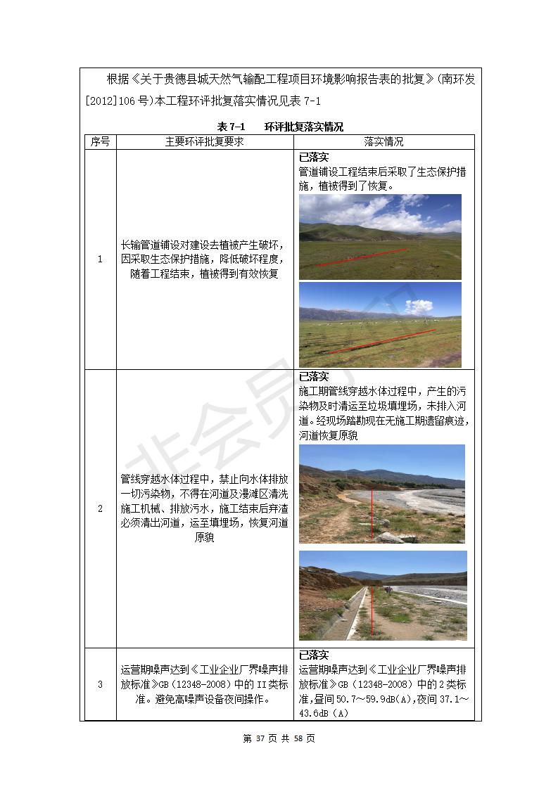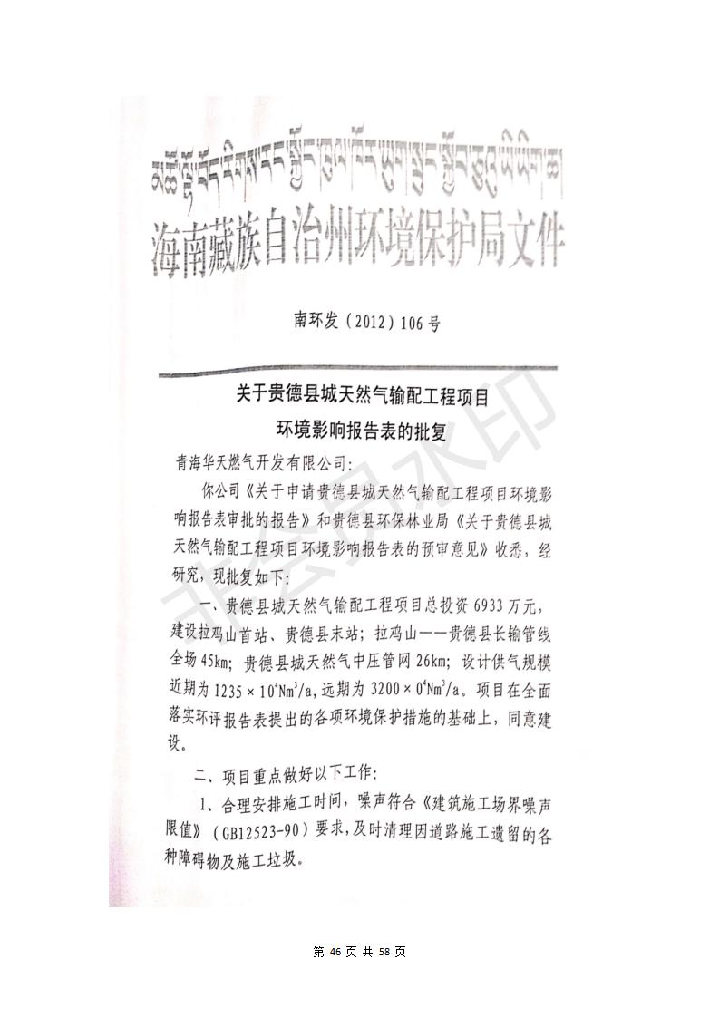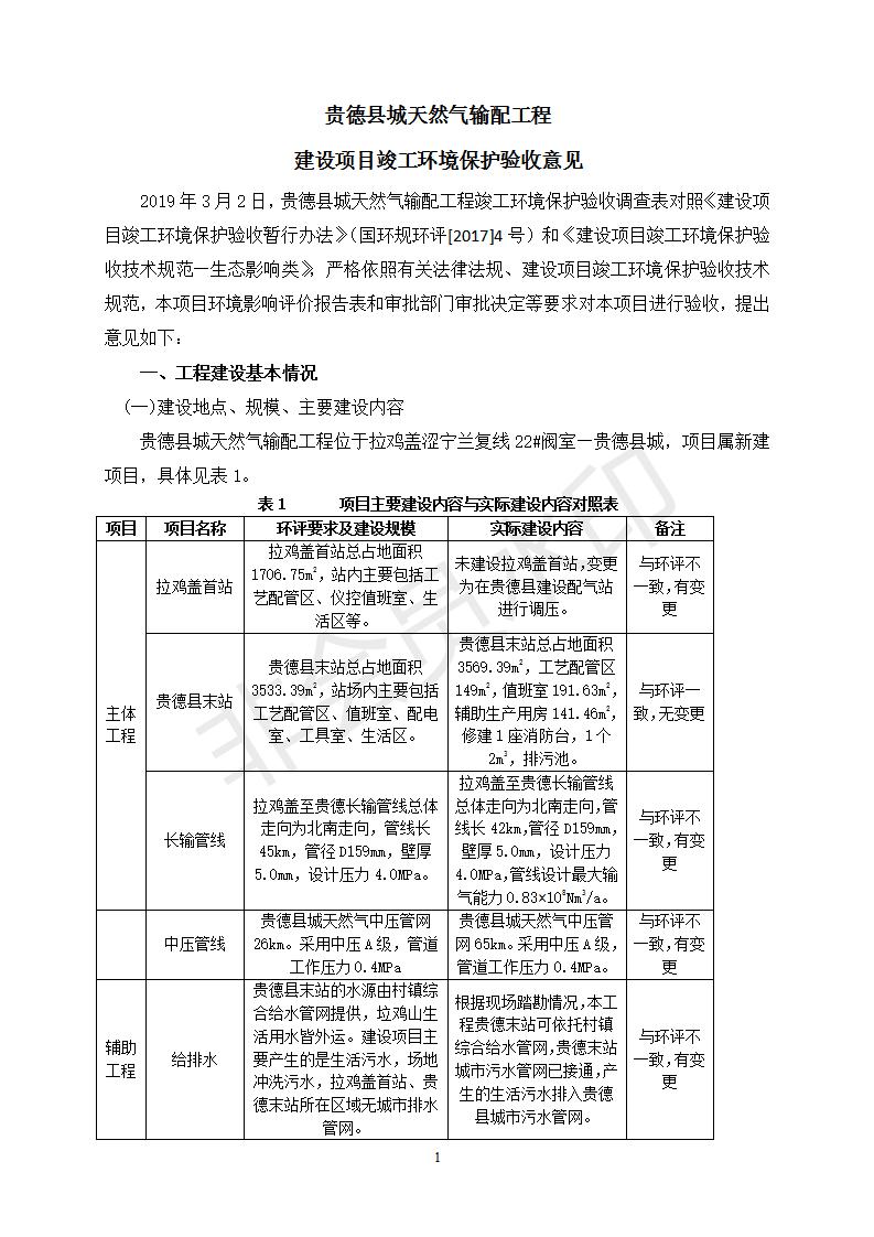 根據(jù)中華人民共和國(guó)務(wù)院令第682號(hào)《國(guó)務(wù)院關(guān)于修改〈建設(shè)項(xiàng)目環(huán)境保護(hù)管理?xiàng)l例〉的決定》和《建設(shè)項(xiàng)目竣工環(huán)境保護(hù)驗(yàn)收暫行辦法》(國(guó)務(wù)院令682號(hào)),貴德縣城輸配管線(xiàn)工程竣工環(huán)境保護(hù)驗(yàn)收內(nèi)容(包括竣工環(huán)境保護(hù)驗(yàn)收調(diào)查表和驗(yàn)收意見(jiàn))公示如下。 一、項(xiàng)目名稱(chēng):貴德縣城天然氣輸配工程 二、地點(diǎn):拉雞蓋澀寧蘭復(fù)線(xiàn)22#閥室-貴德縣城 三、建設(shè)單位:貴德華天燃?xì)忾_(kāi)發(fā)有限公司 四、建設(shè)內(nèi)容:貴德縣末站、貴德縣配氣站、貴德縣中壓管網(wǎng)、拉雞蓋22#閥室-貴德縣城長(zhǎng)輸管線(xiàn) 五、公示時(shí)間:二〇一九年三月十一日至二〇一九年四月八日 六、聯(lián)系人:張工 公示期間,對(duì)上述公示內(nèi)容如有異議,請(qǐng)以書(shū)面形式反饋,個(gè)人須署真實(shí)姓名,單位須加蓋公章。