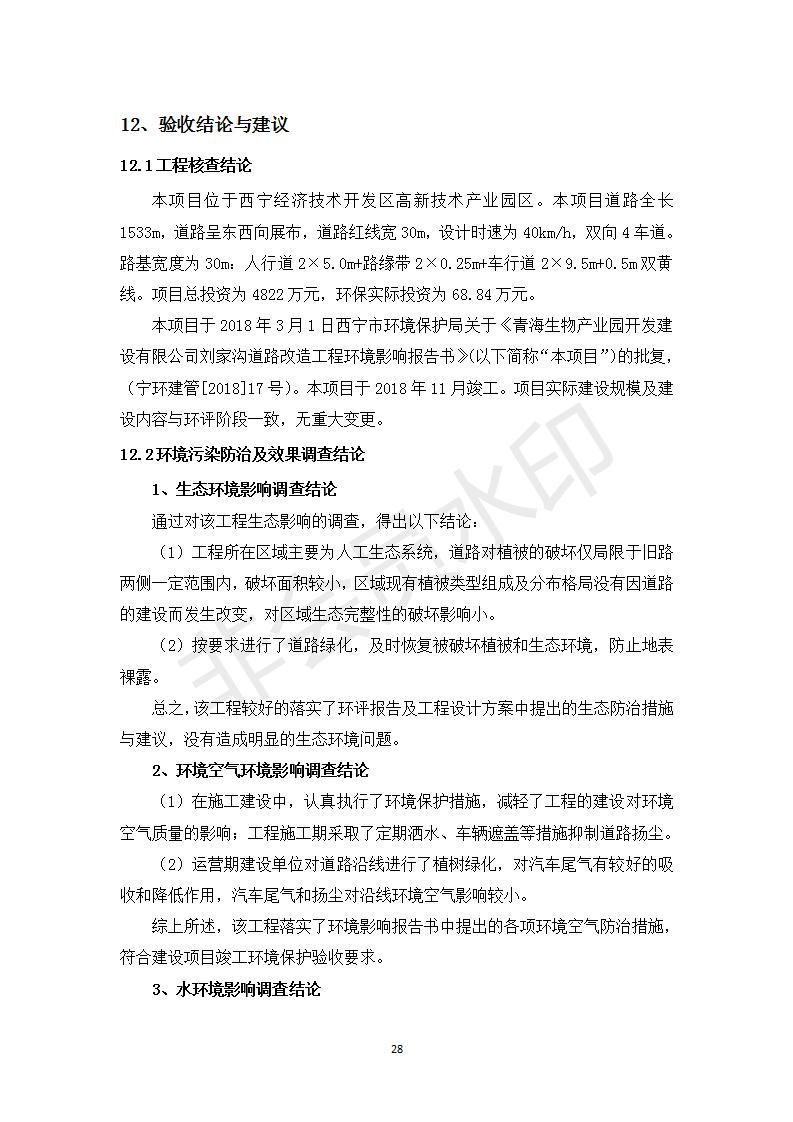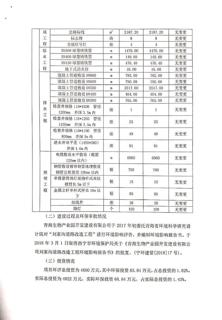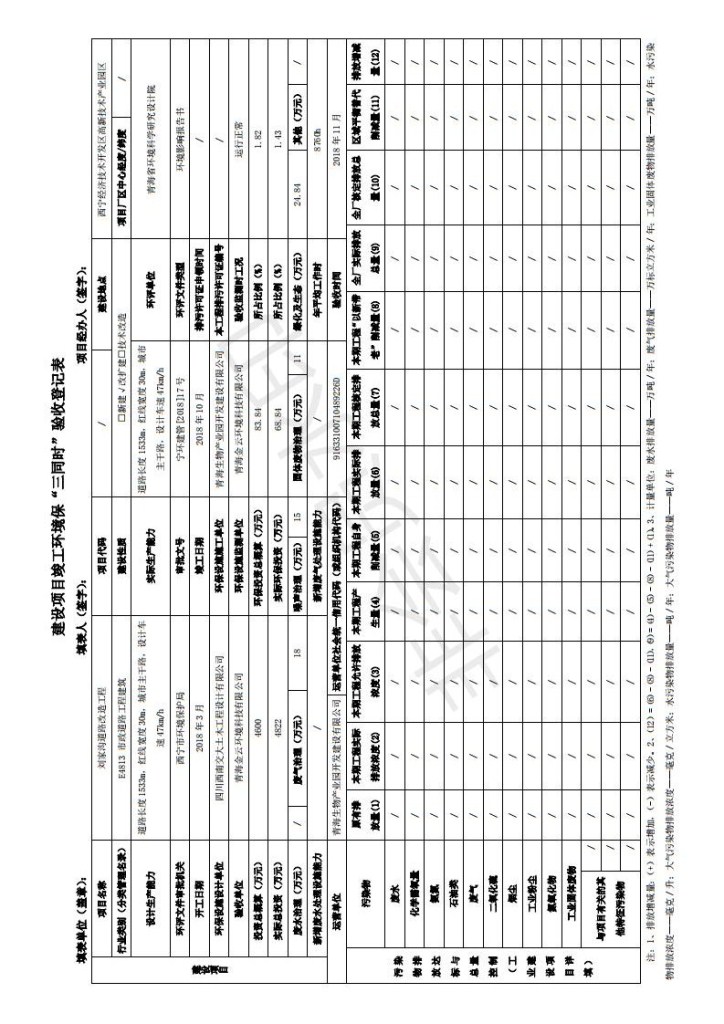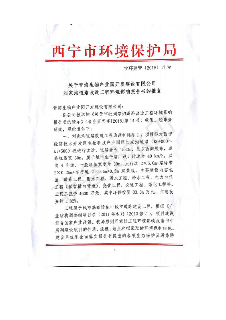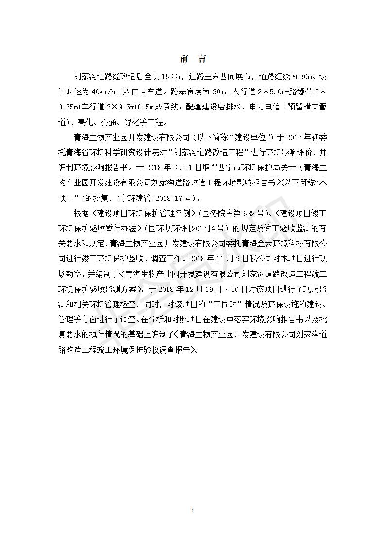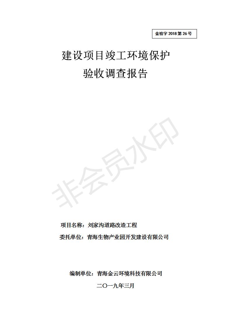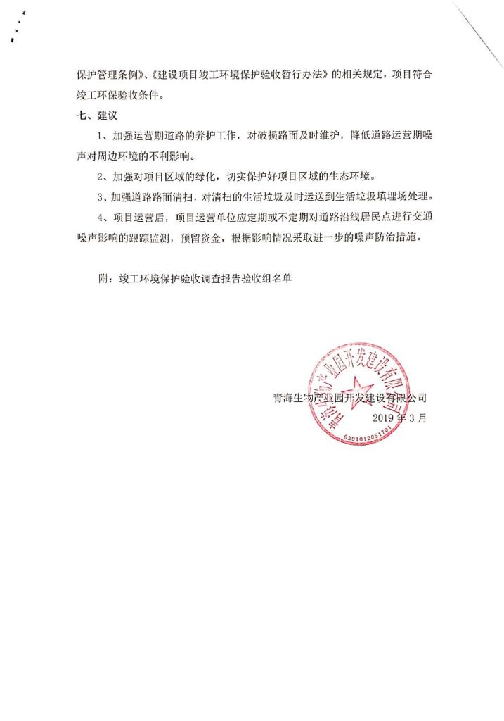 根據(jù)中華人民共和國務院令第682號《國務院關于修改〈建設項目環(huán)境保護管理條例〉的決定》和《建設項目竣工環(huán)境保護驗收暫行辦法》(國務院令682號),劉家溝道路改造工程竣工環(huán)境保護驗收內容(包括竣工環(huán)境保護驗收調查報告和驗收意見)公示如下: 一、項目名稱:劉家溝道路改造工程 二、地點:青海省西寧市城北區(qū)生物園區(qū) 三、建設單位:生物產業(yè)園開發(fā)建設有限公司 四、建設內容:劉家溝道路經改造后全長1533m,道路呈東西向展布,道路紅線為30m。設計時速為40km/h,雙向4車道。 五、公示時間:二〇一九年三月十四日至二〇一九年四月十一日 六、聯(lián)系人:張工 公示期間,對上述公示內容如有異議,請以書面形式反饋,個人須署真實姓名,單位須加蓋公章。