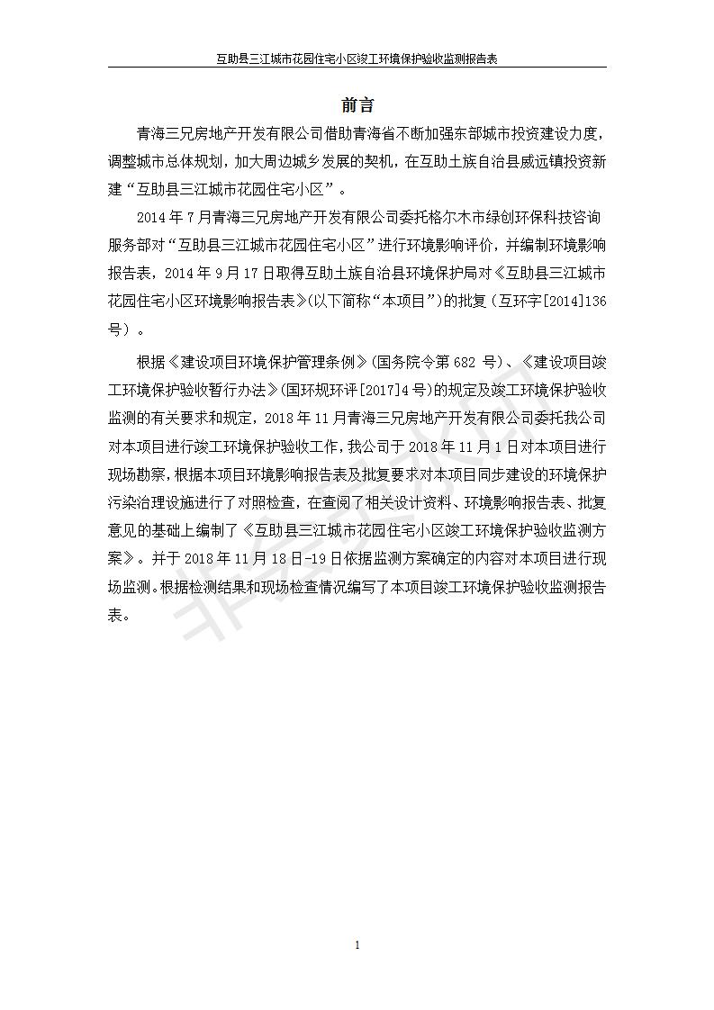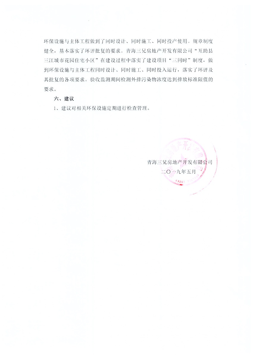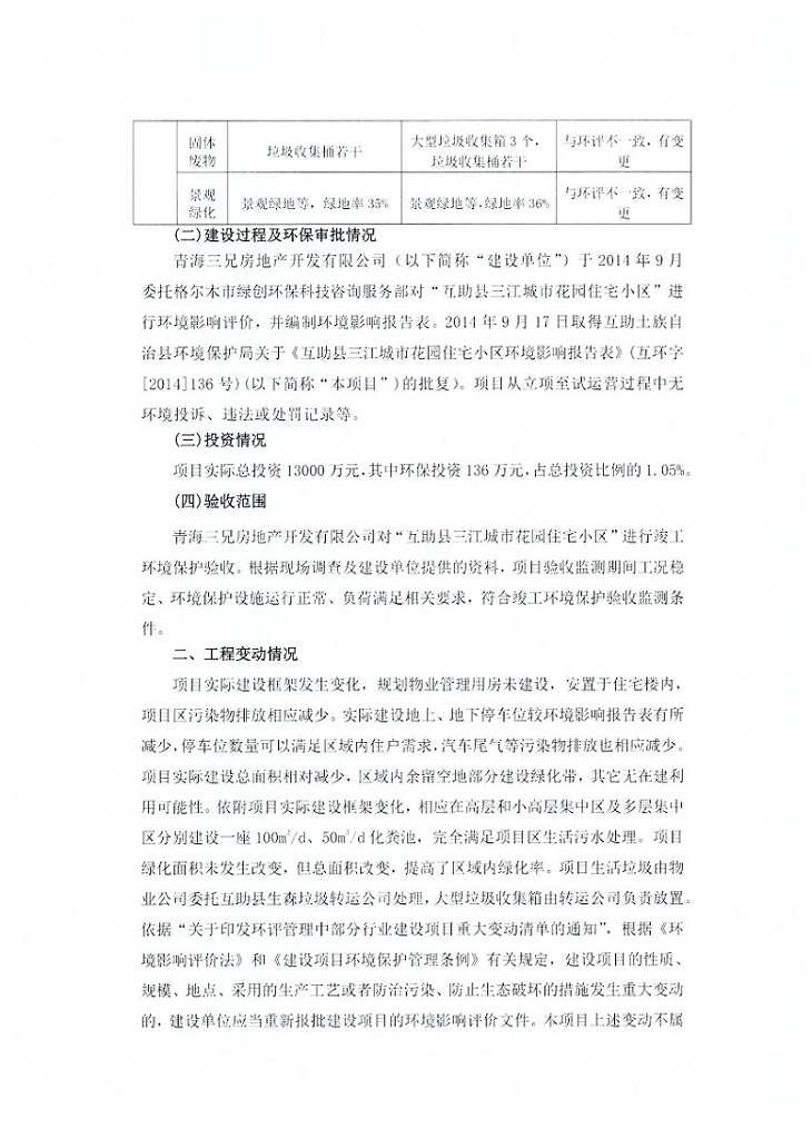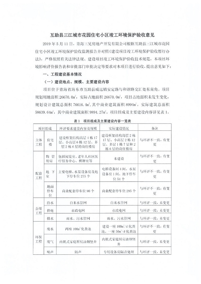 根據(jù)中華人民共和國國務(wù)院令第682號(hào)《國務(wù)院關(guān)于修改〈建設(shè)項(xiàng)目環(huán)境保護(hù)管理?xiàng)l例〉的決定》和《建設(shè)項(xiàng)目竣工環(huán)境保護(hù)驗(yàn)收暫行辦法》(國務(wù)院令682號(hào)),互助縣三江城市花園住宅小區(qū)(包括竣工環(huán)境保護(hù)驗(yàn)收監(jiān)測(cè)報(bào)告表和驗(yàn)收意見)公示如下。 一、項(xiàng)目名稱: 互助縣三江城市花園住宅小區(qū)竣工環(huán)境保護(hù)驗(yàn)收監(jiān)測(cè)報(bào)告表 二、地點(diǎn):青海省海東市互助土族自治縣威遠(yuǎn)鎮(zhèn)安定路與和諧路交匯處東南角 三、建設(shè)單位:青海三兄房地產(chǎn)開發(fā)有限公司 四、建設(shè)內(nèi)容:項(xiàng)目規(guī)劃用地面積26670.0m2,實(shí)際占地面積26670.0m2,項(xiàng)目占地面積未發(fā)生變化,規(guī)劃設(shè)計(jì)建筑總面積76616.4m2,其中商業(yè)建筑面積8994m2。實(shí)際建筑總面積58639.64m2,其中商業(yè)建筑面積9894.27m2。 五、聯(lián)系人:張工 六、聯(lián)系電 話:0971-6515411 七、公示時(shí)間:二〇一九年六月五日至二〇一九年七月三日 公示期間,對(duì)上述公示內(nèi)容如有異議,請(qǐng)以書面形式反饋,個(gè)人須署真實(shí)姓名,單位須加蓋公章。