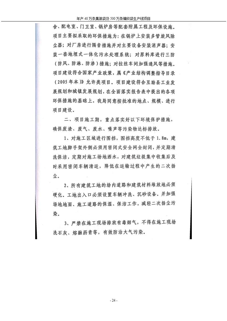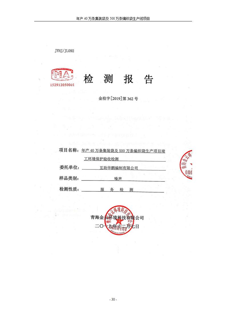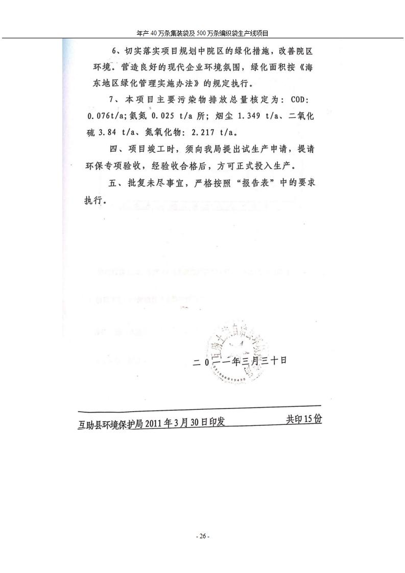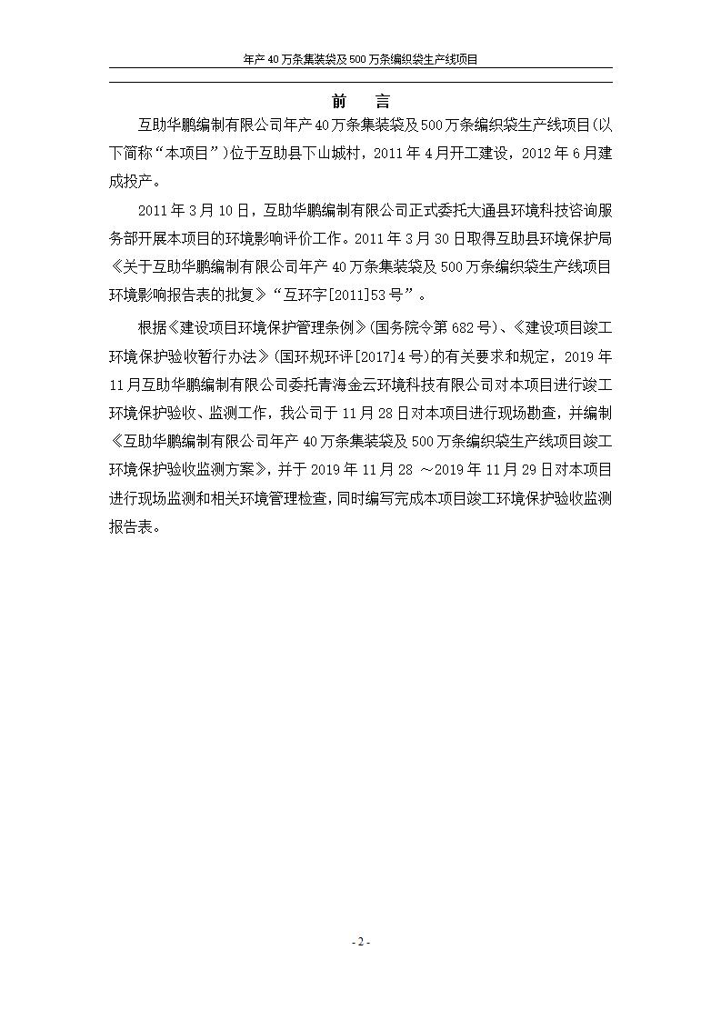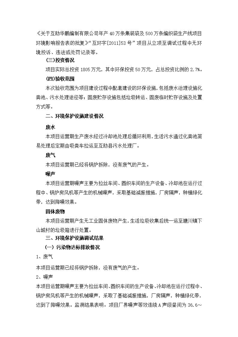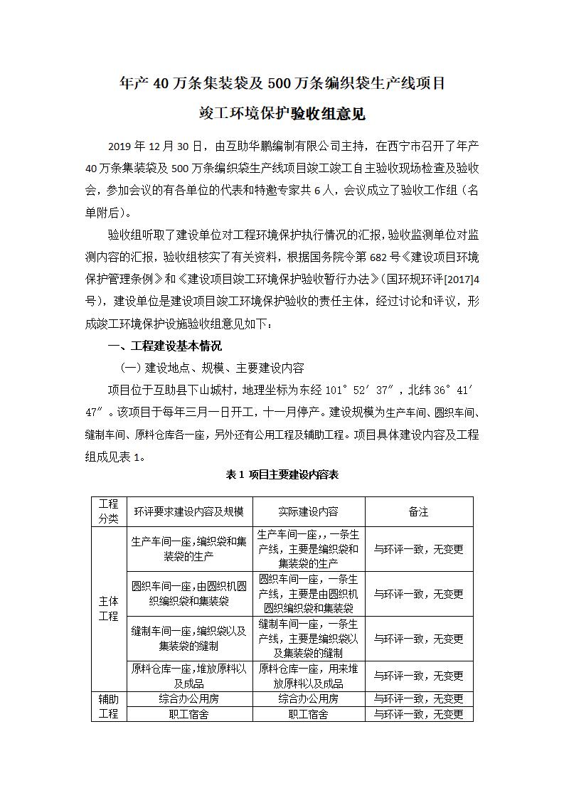 根據(jù)中華人民共和國國務(wù)院令第682號《國務(wù)院關(guān)于修改〈建設(shè)項(xiàng)目環(huán)境保護(hù)管理?xiàng)l例〉的決定》和《建設(shè)項(xiàng)目竣工環(huán)境保護(hù)驗(yàn)收暫行辦法》(國務(wù)院令682號),年產(chǎn)40萬條集裝袋及500萬條編織袋生產(chǎn)線項(xiàng)目(包括竣工環(huán)境保護(hù)驗(yàn)收調(diào)查表和驗(yàn)收意見)公示如下。 一、項(xiàng)目名稱: 年產(chǎn)40萬條集裝袋及500萬條編織袋生產(chǎn)線項(xiàng)目 二、地點(diǎn):互助縣塘川鎮(zhèn)下山城村 五、聯(lián)系人:張工 六、聯(lián)系電話:0971-6515411 七、公示時(shí)間:二〇二〇年一月十三日至二〇二〇年二月十二日 公示期間,對上述公示內(nèi)容如有異議,請以書面形式反饋,個(gè)人須署真實(shí)姓名,單位須加蓋公章。