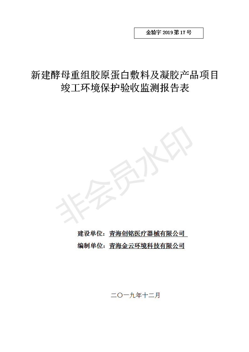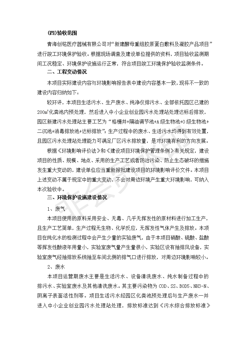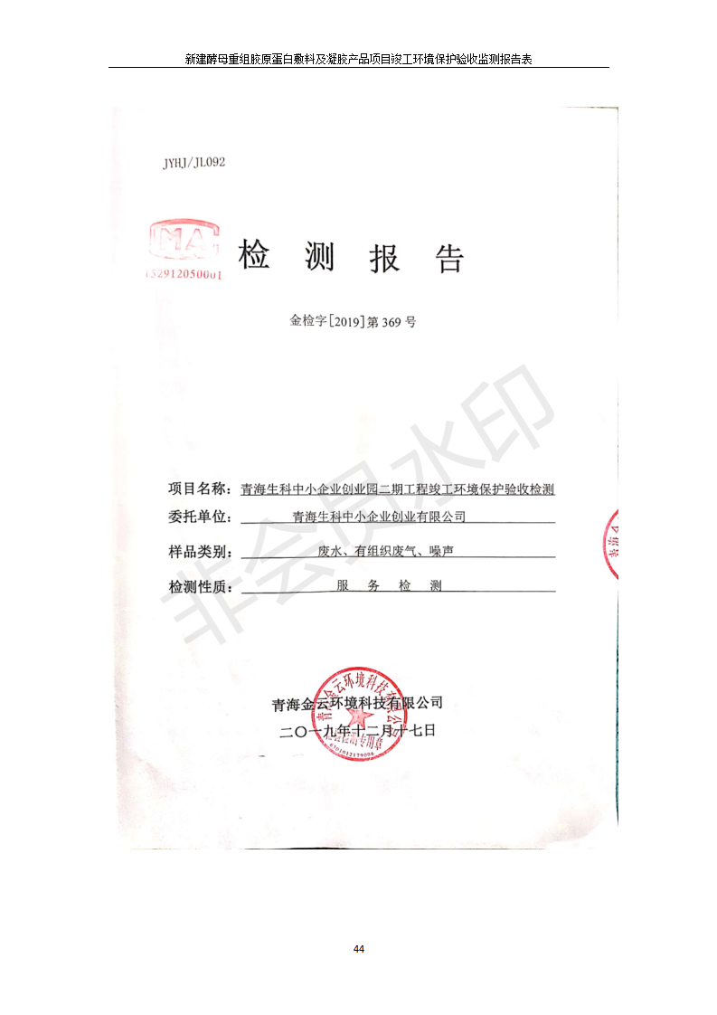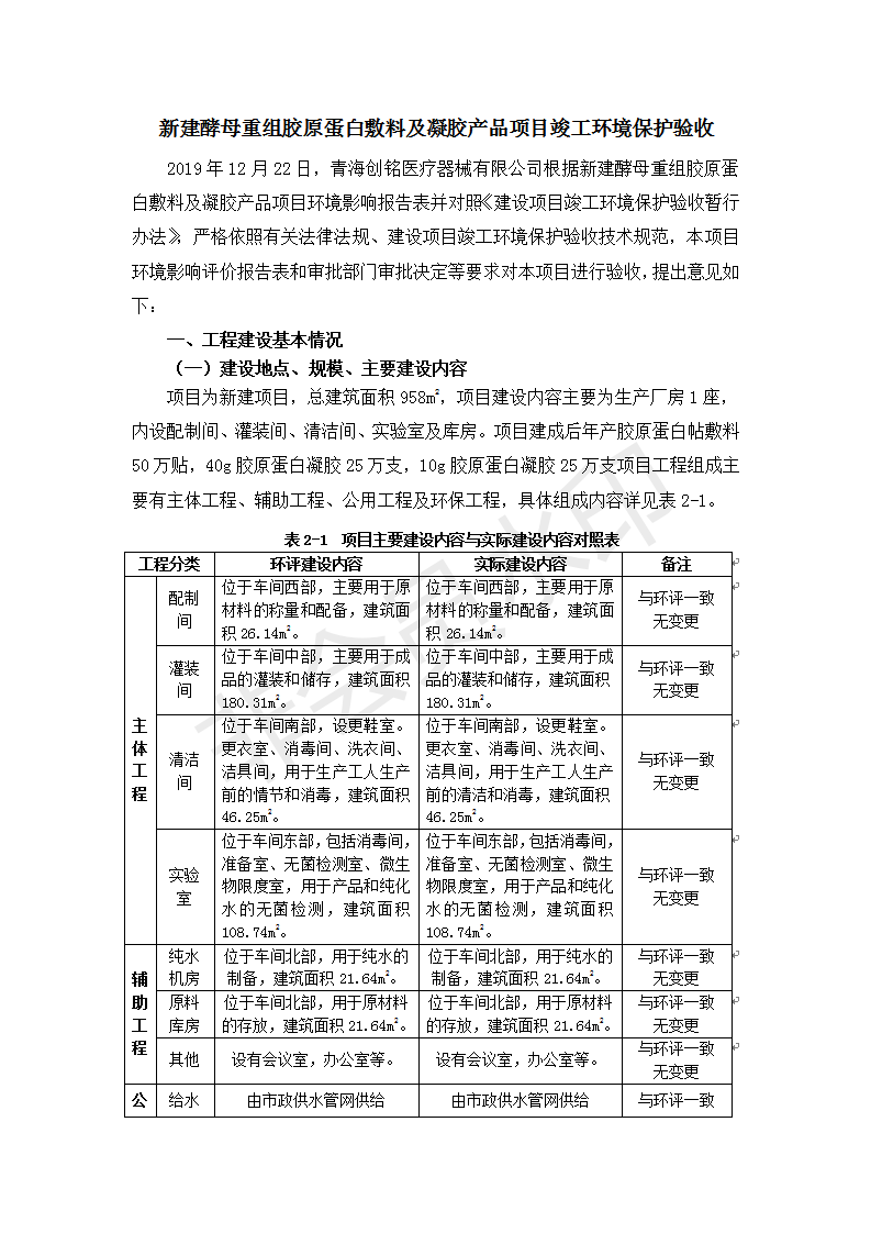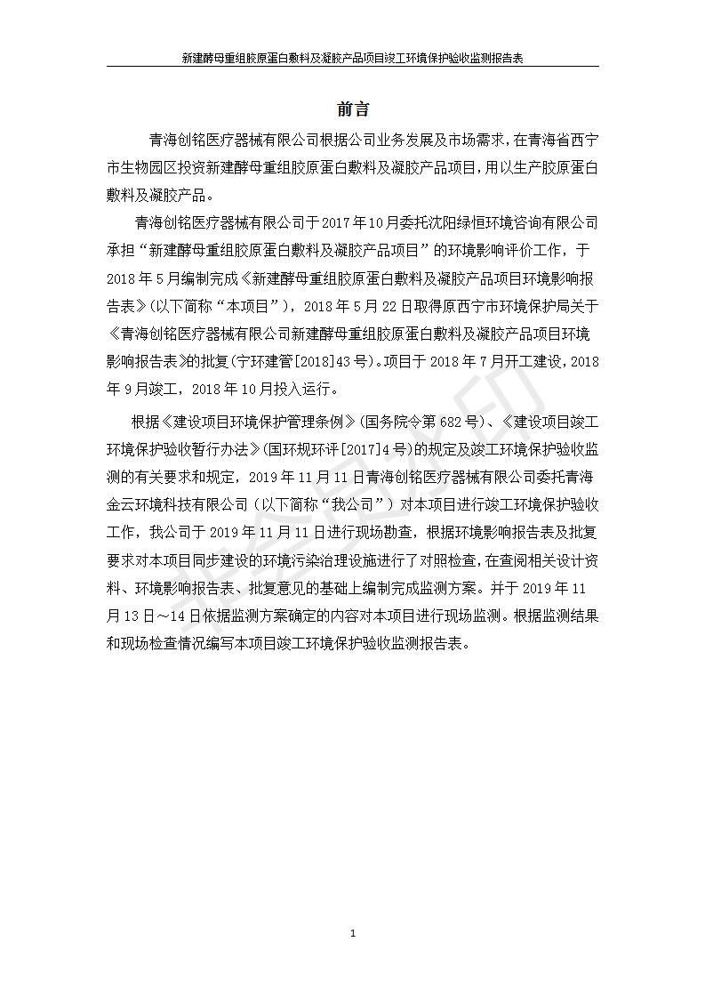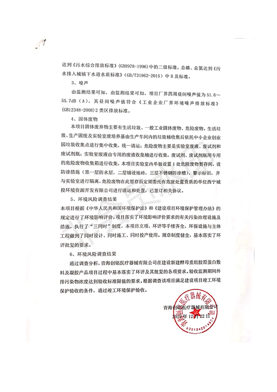 根據(jù)中華人民共和國(guó)國(guó)務(wù)院令第682號(hào)《國(guó)務(wù)院關(guān)于修改〈建設(shè)項(xiàng)目環(huán)境保護(hù)管理?xiàng)l例〉的決定》和《建設(shè)項(xiàng)目竣工環(huán)境保護(hù)驗(yàn)收暫行辦法》(國(guó)務(wù)院令682號(hào)),新建酵母重組膠原蛋白敷料及凝膠產(chǎn)品項(xiàng)目(包括竣工環(huán)境保護(hù)驗(yàn)收監(jiān)測(cè)報(bào)告表和驗(yàn)收意見(jiàn))公示如下。 一、項(xiàng)目名稱(chēng):新建酵母重組膠原蛋白敷料及凝膠產(chǎn)品項(xiàng)目 二、地點(diǎn):西寧市生物園區(qū)經(jīng)四路26號(hào)15號(hào)樓2層 五、聯(lián)系人:董繼風(fēng) 六、聯(lián)系電話:18606125050 七、公示時(shí)間:二〇二〇年一月十三日至二〇二〇年二月十二日 公示期間,對(duì)上述公示內(nèi)容如有異議,請(qǐng)以書(shū)面形式反饋,個(gè)人須署真實(shí)姓名,單位須加蓋公章。
