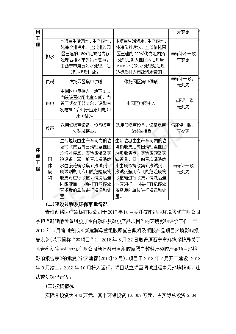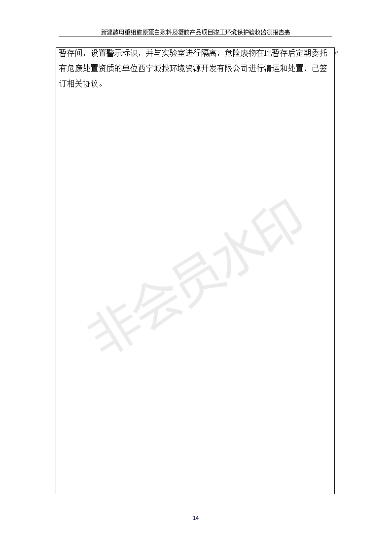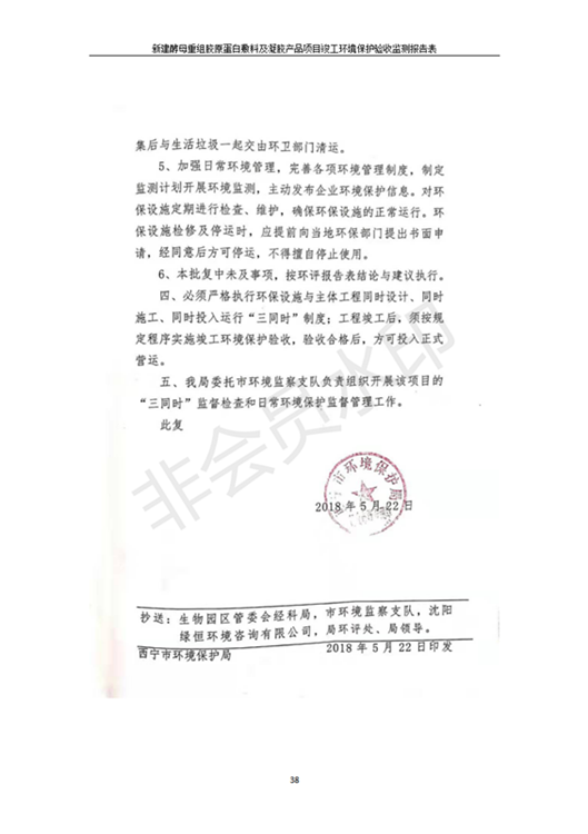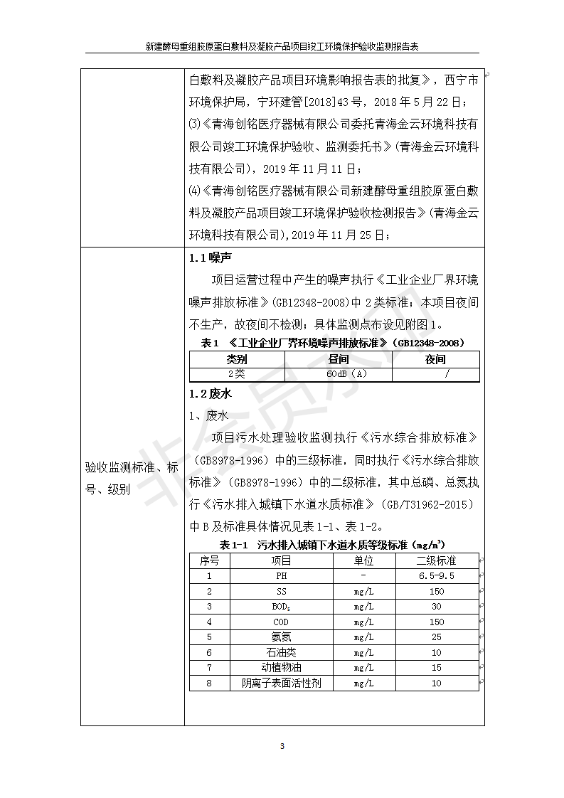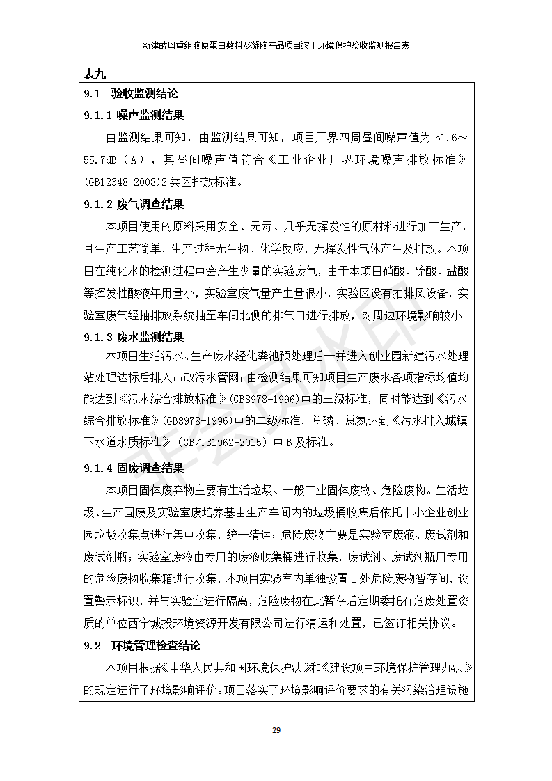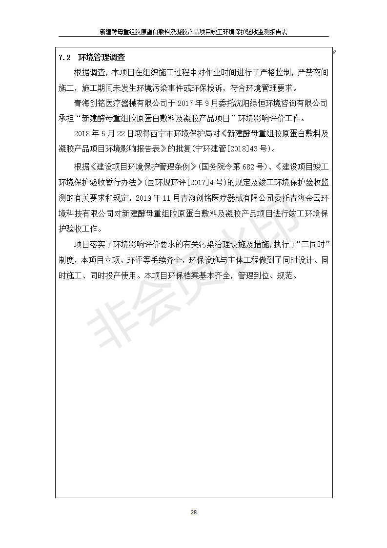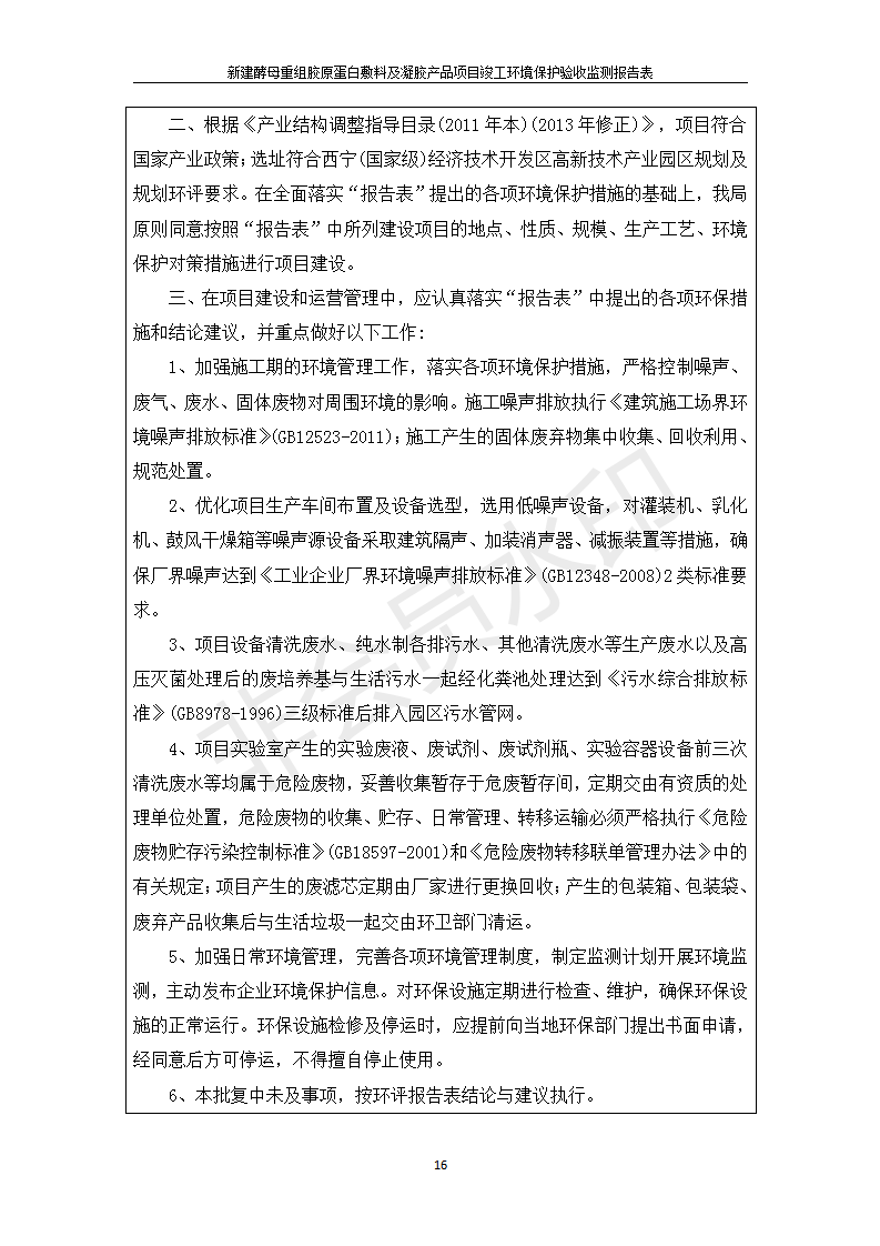 根據(jù)中華人民共和國(guó)國(guó)務(wù)院令第682號(hào)《國(guó)務(wù)院關(guān)于修改〈建設(shè)項(xiàng)目環(huán)境保護(hù)管理?xiàng)l例〉的決定》和《建設(shè)項(xiàng)目竣工環(huán)境保護(hù)驗(yàn)收暫行辦法》(國(guó)務(wù)院令682號(hào)),新建酵母重組膠原蛋白敷料及凝膠產(chǎn)品項(xiàng)目(包括竣工環(huán)境保護(hù)驗(yàn)收監(jiān)測(cè)報(bào)告表和驗(yàn)收意見(jiàn))公示如下。 一、項(xiàng)目名稱(chēng):新建酵母重組膠原蛋白敷料及凝膠產(chǎn)品項(xiàng)目 二、地點(diǎn):西寧市生物園區(qū)經(jīng)四路26號(hào)15號(hào)樓2層 五、聯(lián)系人:董繼風(fēng) 六、聯(lián)系電話:18606125050 七、公示時(shí)間:二〇二〇年一月十三日至二〇二〇年二月十二日 公示期間,對(duì)上述公示內(nèi)容如有異議,請(qǐng)以書(shū)面形式反饋,個(gè)人須署真實(shí)姓名,單位須加蓋公章。